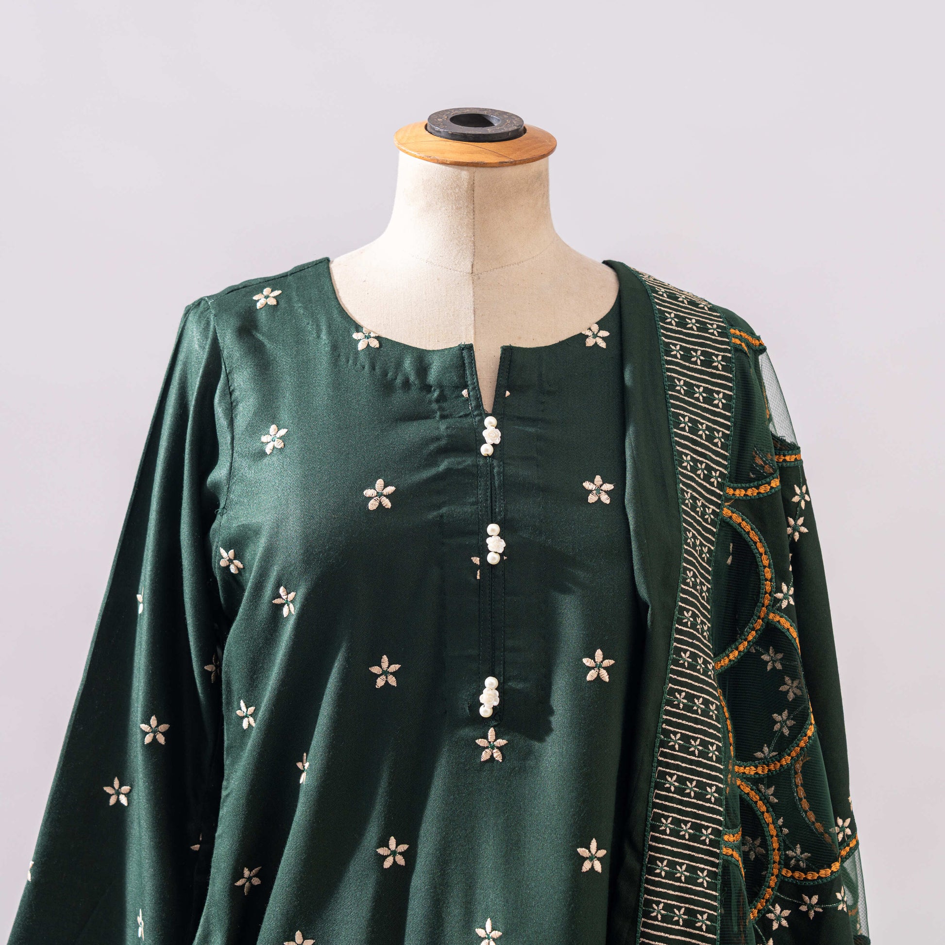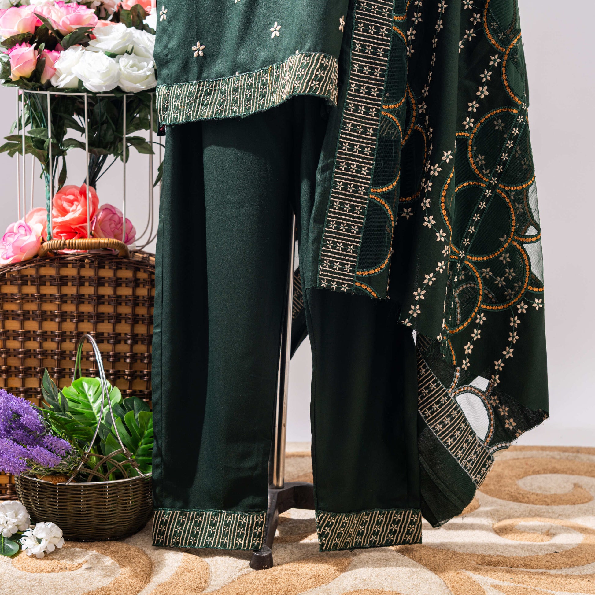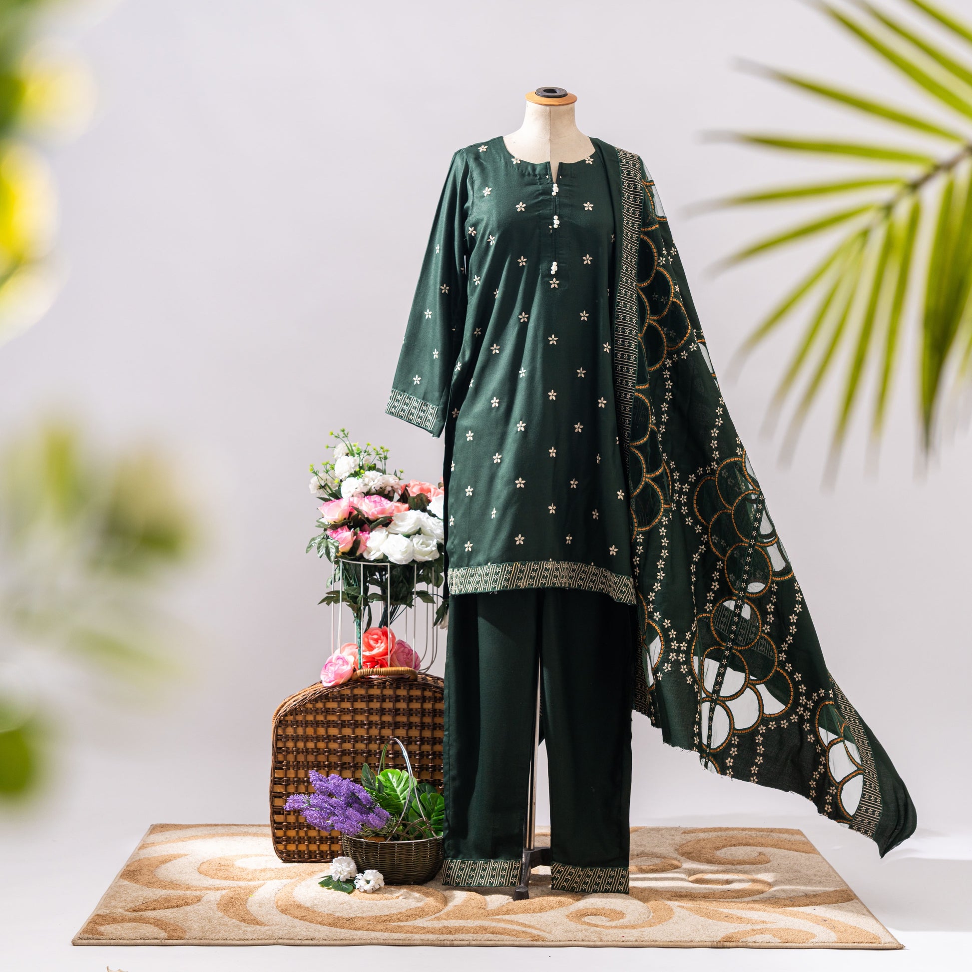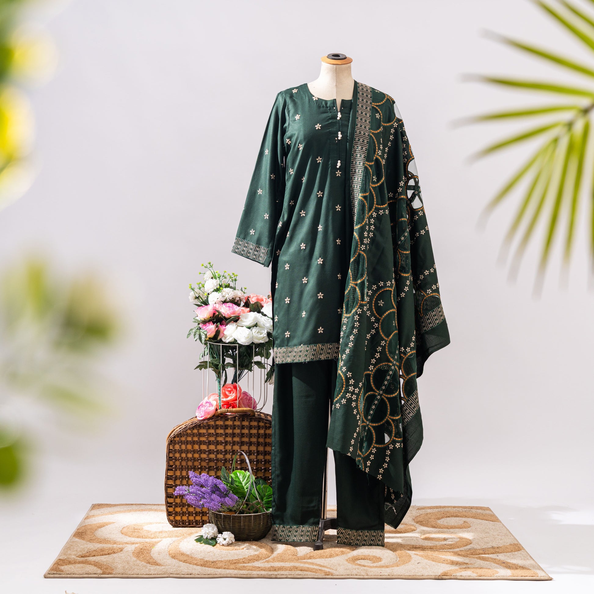 Elevate your festive wardrobe with our Luxury Emerald Green Embroidered 3-Piece Lawn Suit, perfect for formal events and traditional gatherings. This stunning ensemble includes:
